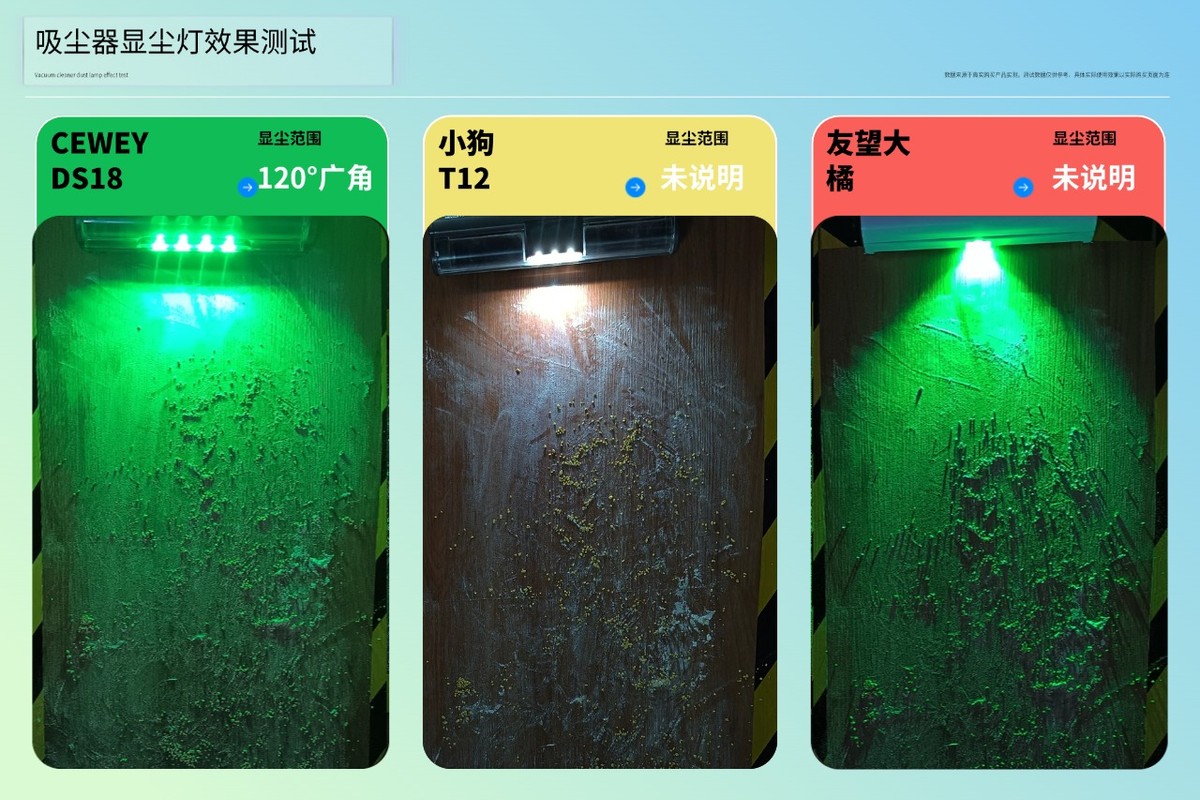 测试总结:显尘效果优秀:CEWEY显尘效果良好:小狗显尘效果一般:友望显尘灯测试里,CEWEY DS18 的显尘灯亮度高、照射范围广,灯光下的颗粒物十分明显,哪怕是细小灰尘也能清晰显现,基本上能覆盖整个测试区域,没什么遗漏。小狗的显尘效果整体可以,常见颗粒物在灯光下看得很清楚,但边缘区域亮度稍弱,对极细微灰尘的显现能力比不上 CEWEY,细微灰尘的辨识度会差一点。友望的显尘灯亮度不够,照射范围也窄,在低光环境下只能显出部分较大颗粒物,对细尘的提示作用不够突出,很难靠它发现细小灰尘。
