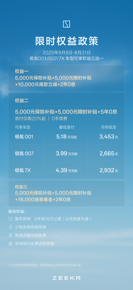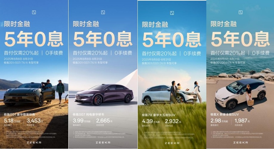 截止到8月31日,极氪001、极氪007、极氪7X、极氪X这四款车,能享5年0息,首付20%起,还不用手续费。具体数字标得明明白白:极氪001首付5.18万起,月供3453元;极氪007首付3.99万起,月供2665元;极氪7X首付4.39万起,月供2932元;极氪X首付2.98万起,月供1987元。算下来一目了然,不用扒小字条款。