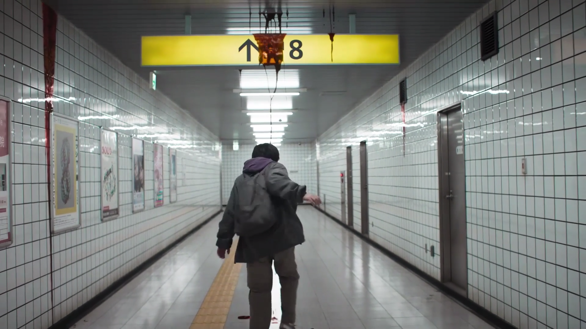 这时候他走进了一条白色瓷砖的走廊,上边挂着“8号出口”的指示牌。