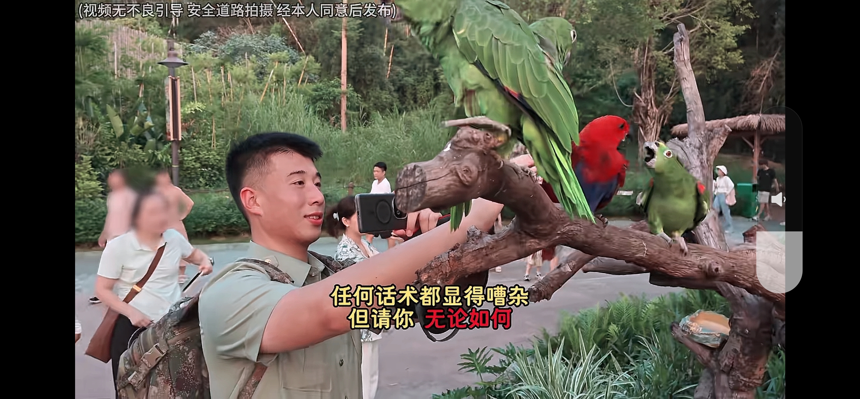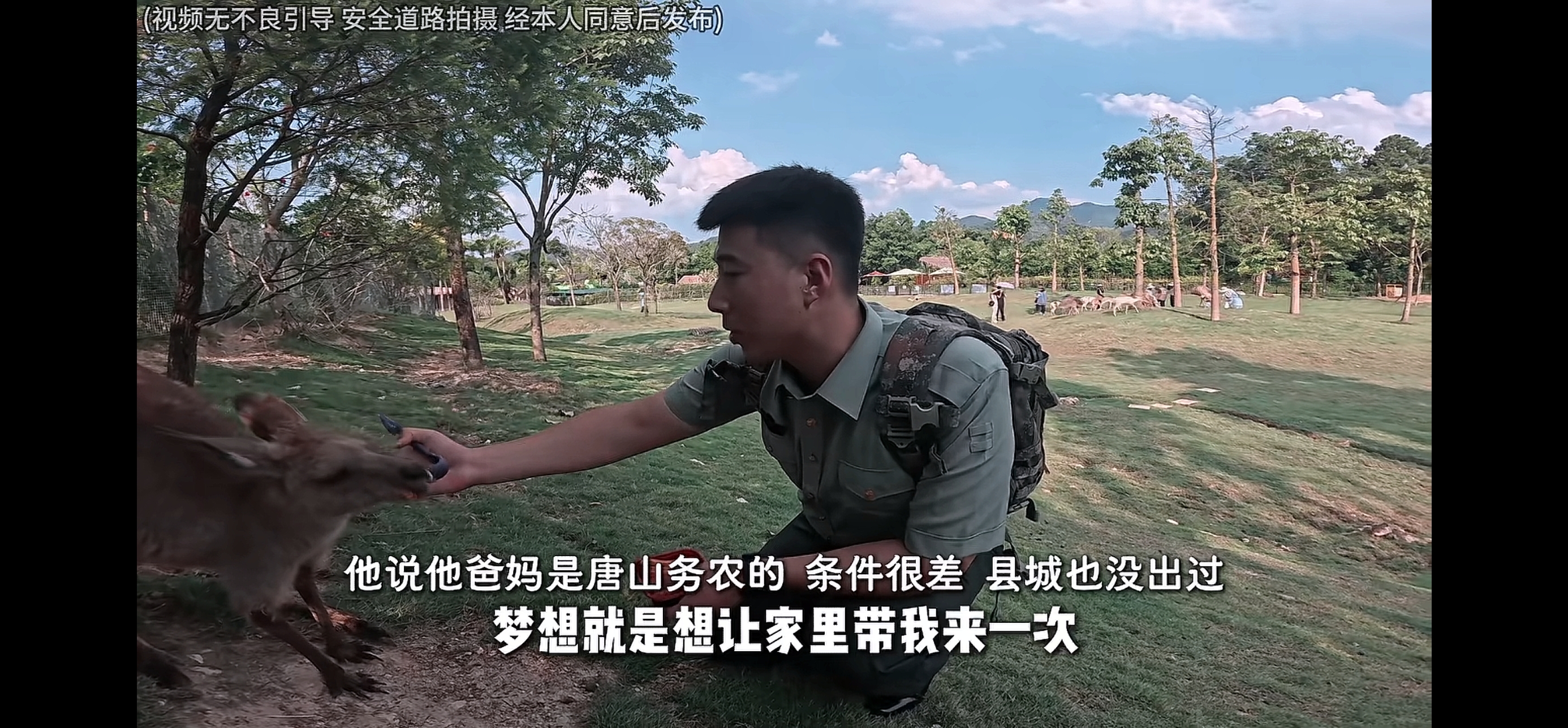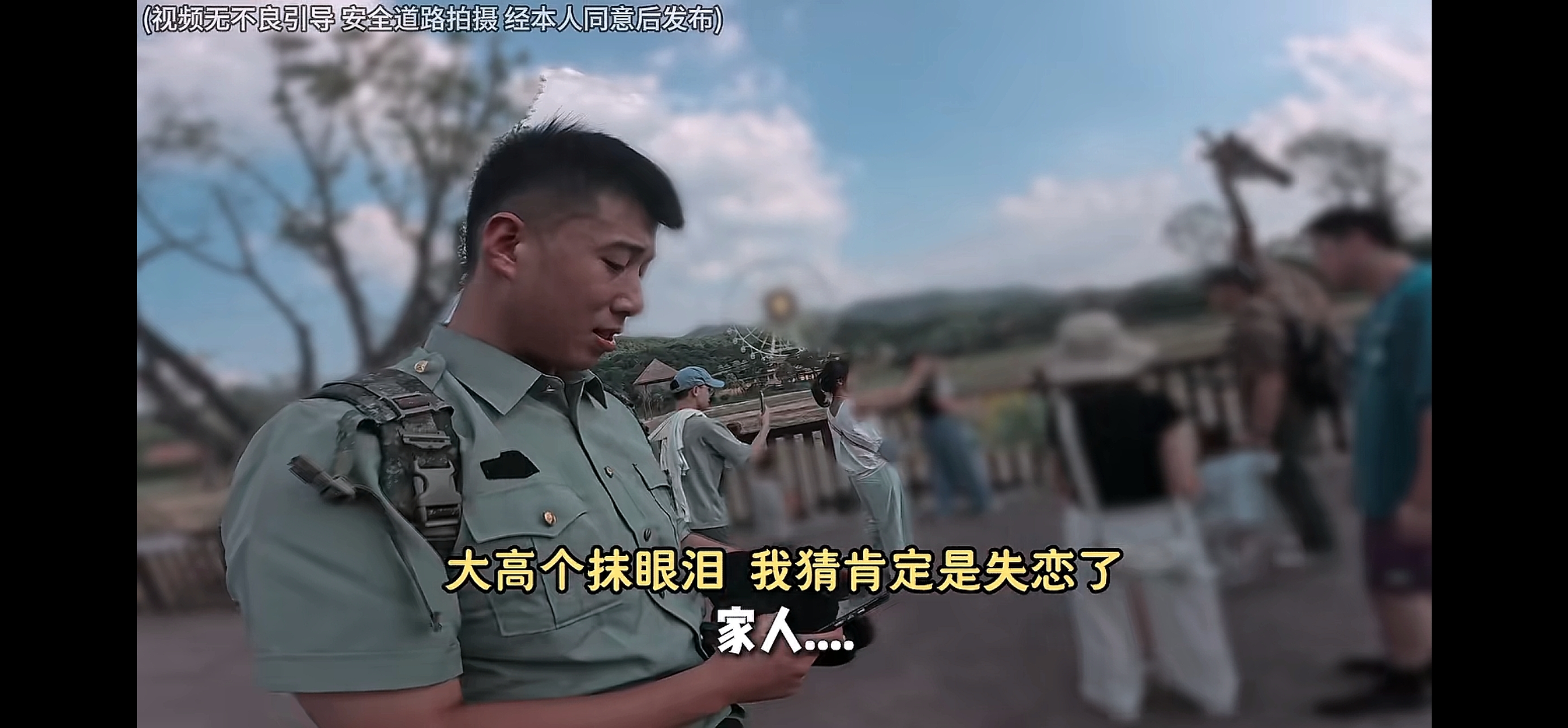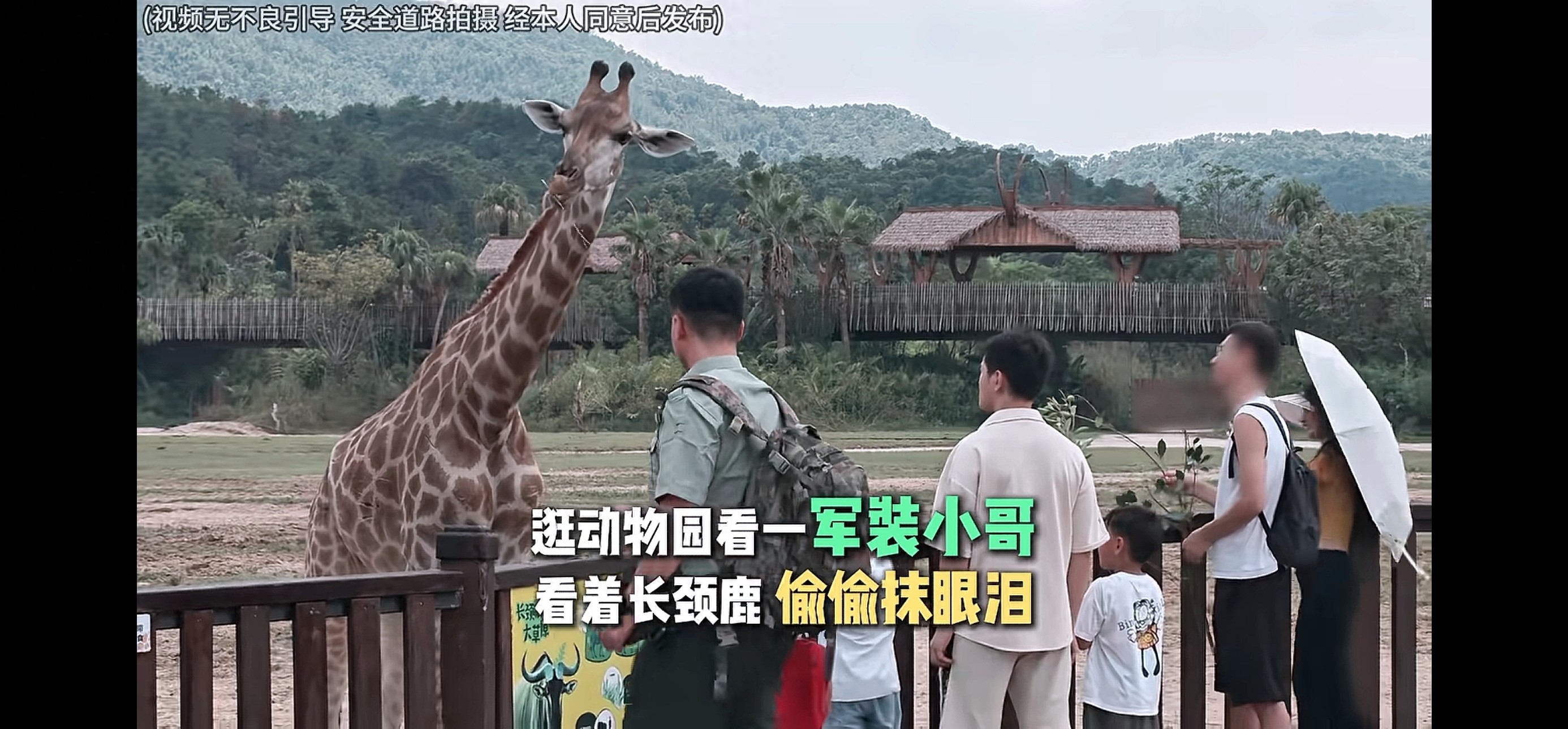 故事的主角是一位刚退役不久的小伙。初见他时,正在看着长颈鹿,后来小伙找到了一位正在拍摄的热心大哥,询问可以帮我拍张照吗,起初这位热心的大哥看出小伙心情比较低落以为小伙刚刚失恋后来,得知他刚结束军旅生涯,开启人生新篇章。当话题转到家人,小伙的神情有些落寞,轻声说道家人已经去世了,言语间满是思念。
