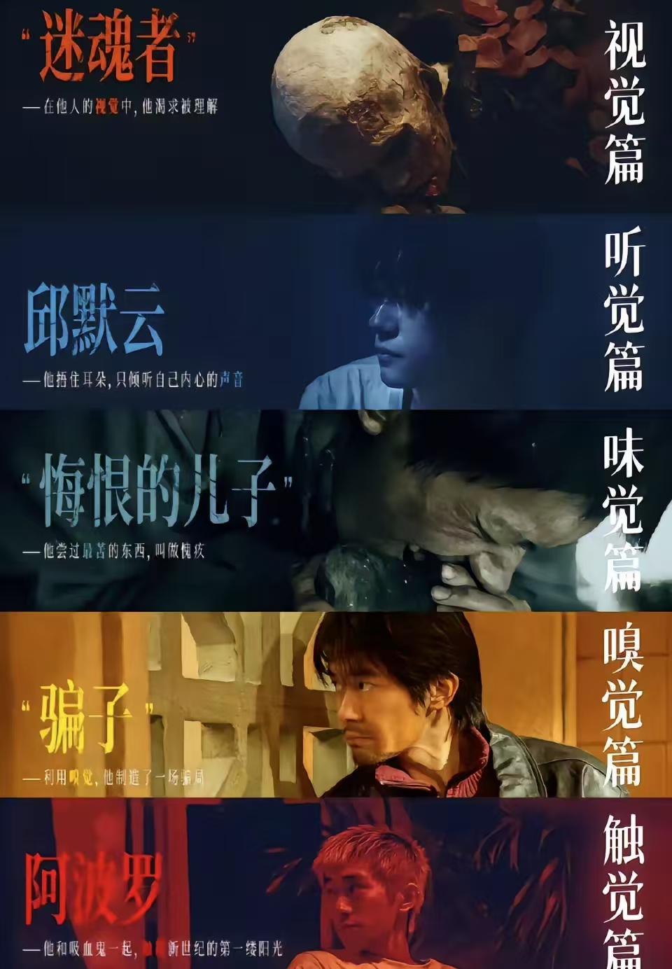 电影设定是未来人类不会做梦了,只有易烊千玺演的“迷魂者”还能做梦,结果被舒淇追捕。故事分成六段,千玺一人演了五个角色,从默片怪物到末世混混,每个角色对应一种感官体验。比如视觉篇是黑白默片风,听觉篇搞民国谍战,味觉篇干脆讲和尚尝苦石头。