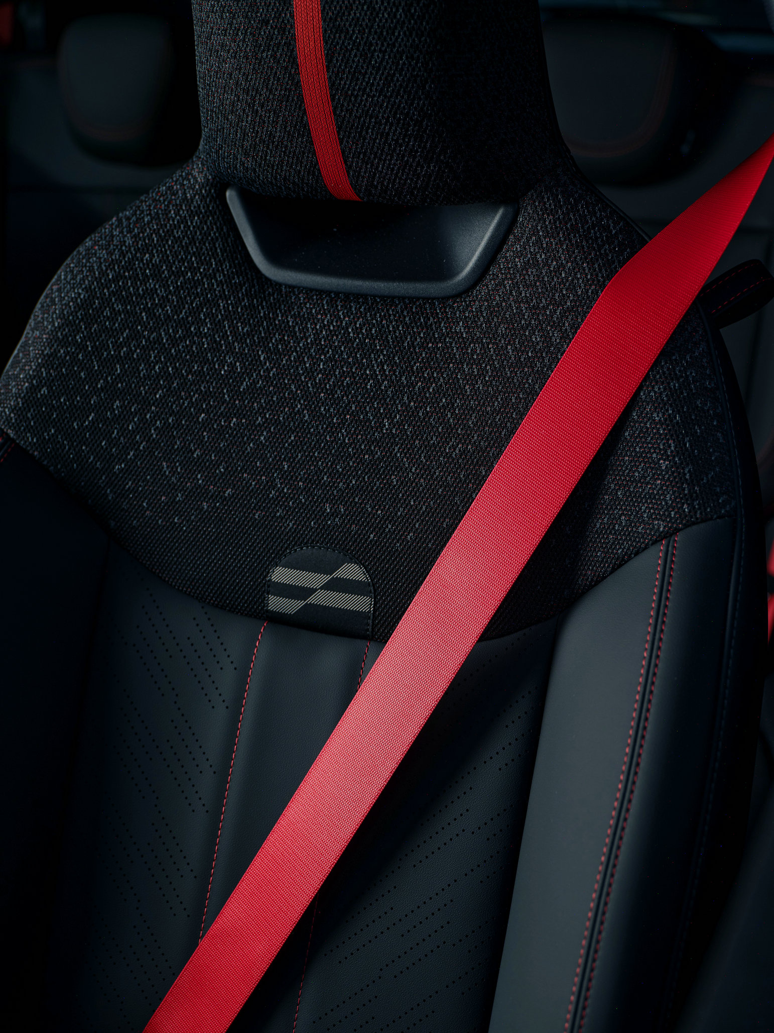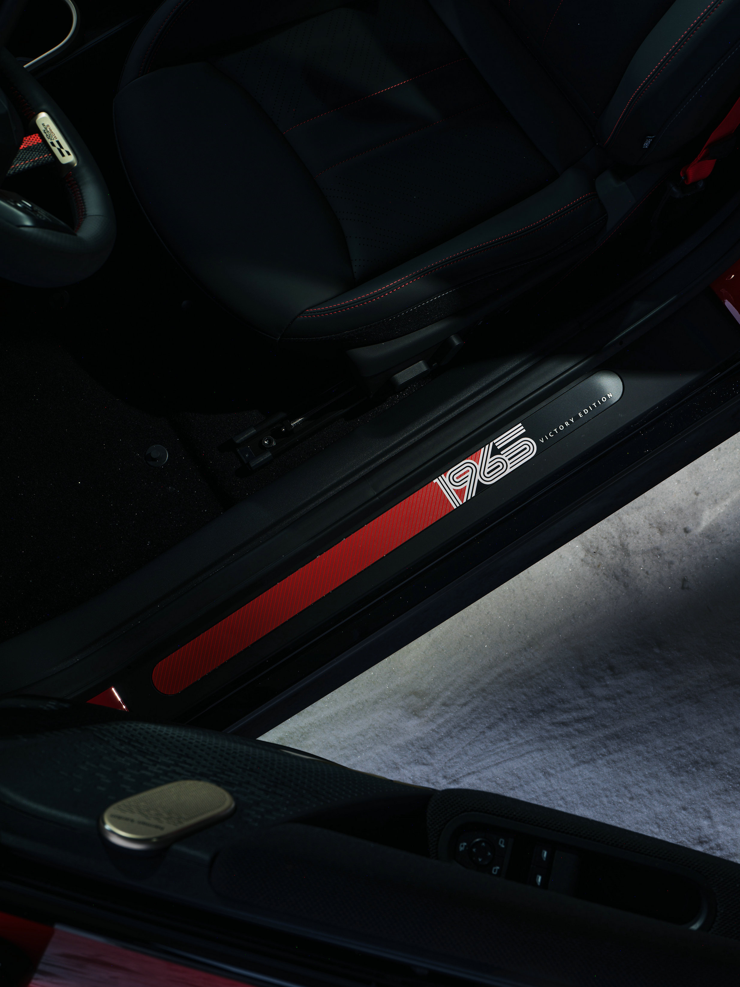 设计团队以"冰雪赛道切片"为灵感,将辣椒红车身与雪地轨迹压纹白顶结合,形成视觉张力的红白撞色。雪色轮毂搭配红色制动卡钳,在静止状态下仍传递出跃跃欲试的竞速姿态。车门处的52号图腾采用激光雕刻工艺,三道平行线分别象征1965年、2001年达喀尔拉力赛和2025年电动化新征程的三重征服。