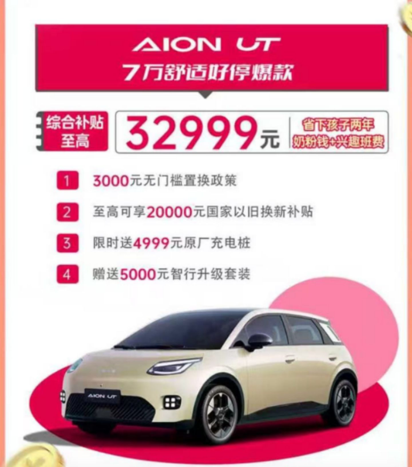 售价方面,2025款埃安UT全系指导价6.98万起,国补进入倒计时,埃安UT叠加补贴综合优惠至高32999元,全年购车最价时机,此时不抢等于损失5000元(错过今年的补贴,明年还得交购置税)。