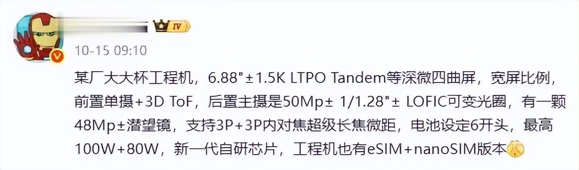 某厂大大杯工程机,6.88"±1.5K LTPO Tandem等深微四曲屏,宽屏比例,前置单摄+3D ToF,后置主摄是50Mp± 1/1.28"± LOFIC可变光圈,有一颗48Mp±潜望镜,支持3P+3P内对焦超级长焦微距,电池设定6开头,最高100W+80W,新一代自研芯片,工程机也有eSIM+nanoSIM版本