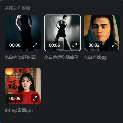 上传一张图片,选择一段参考视频(默认有4段动作视频)。