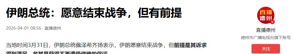 德黑兰这几天发出的信号已经很不对劲。3月31日,伊朗总统佩泽希齐扬对外宣布,只要安全得到保证,伊朗就可以停火。