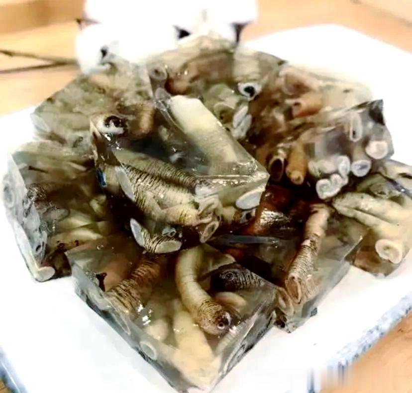 · 简介:特色“暗黑”美食。主料是滩涂沙虫(星虫),富含胶质,熬煮冷却后成冻。口感Q弹,配蒜蓉、醋、芥末酱汁。