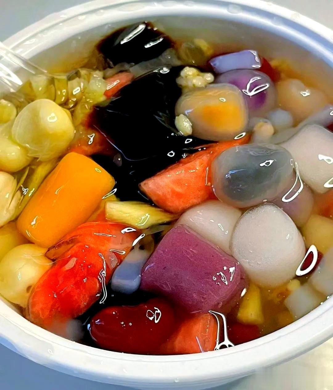 · 简介:夏日消暑圣品。刨冰打底,加入西瓜、菠萝、石花膏、芋圆、红豆等多种配料,淋上糖水蜂蜜。