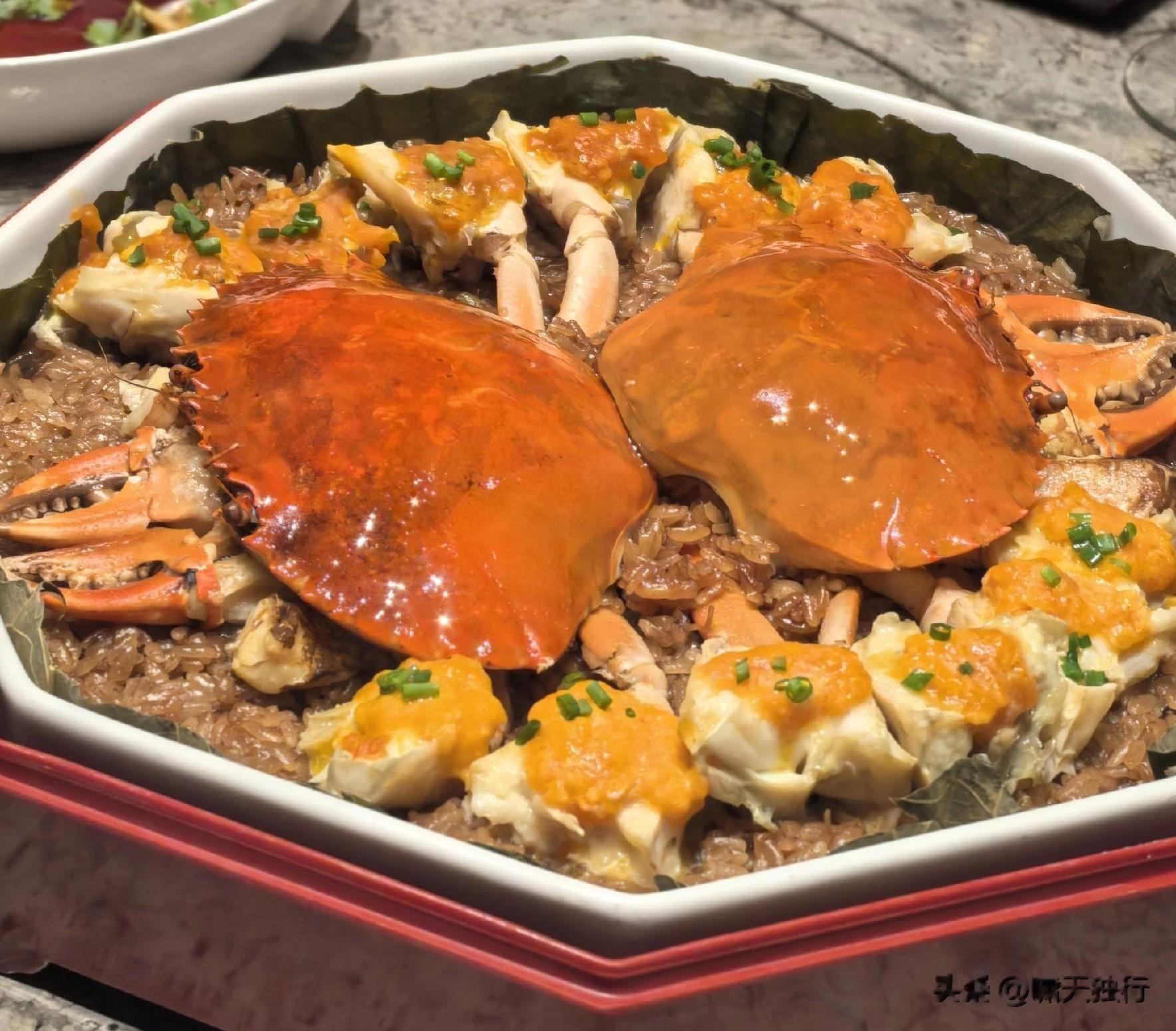 · 简介:宴席大菜。膏满黄肥的红蟳铺在香菇肉丝糯米饭上蒸制,蟹膏的油脂渗入糯米饭中,咸鲜无比。