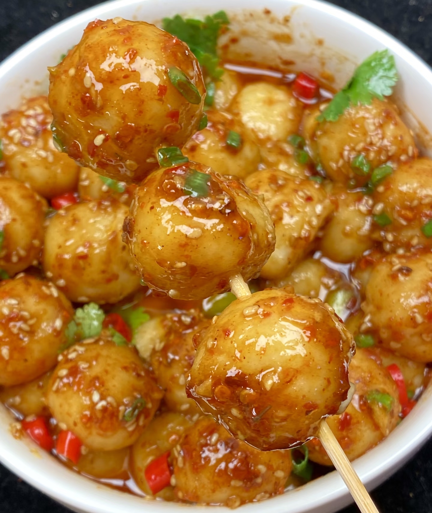 把沥干水的土豆丸子倒进酸辣汁里,用筷子轻轻翻拌,让每个丸子都裹满酱汁。这时候可以撒把葱花或香菜点缀,喜欢花生碎的也可以来点,瞬间提升颜值和口感。看!刚才还其貌不扬的土豆丸子,现在裹着晶莹的酱汁,在灯光下泛着诱人的光泽,是不是像极了餐厅里的精致小食?