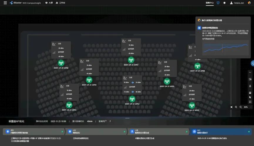 Wi-Fi优化Agent借助高清数字地图智能感知楼内AP接入点的运行状态,自主计算并动态调整教室内AP的发射功率,在确保无线信号强度的同时,有效避免了对相邻教室的信号干扰。此外,Agent还自动优化信道配置,彻底解决了长期存在的信道冲突问题。经过一系列精准调控与优化,楼内信号强度恢复“满格”,有力保障了智慧教学的顺畅运行。