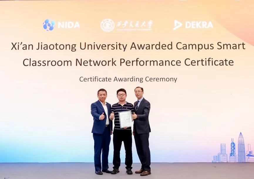 2025年,全球专业的检验检测认证机构DEKRA德凯与全球固定网络创新联盟(NIDA)联合为西安交通大学颁发了校园网络评估证书,标志着学校在校园网络——特别是智慧教室场景的规划与建设方面已达到行业领先水准,为全国高校的数智化基础设施建设树立了新标杆。