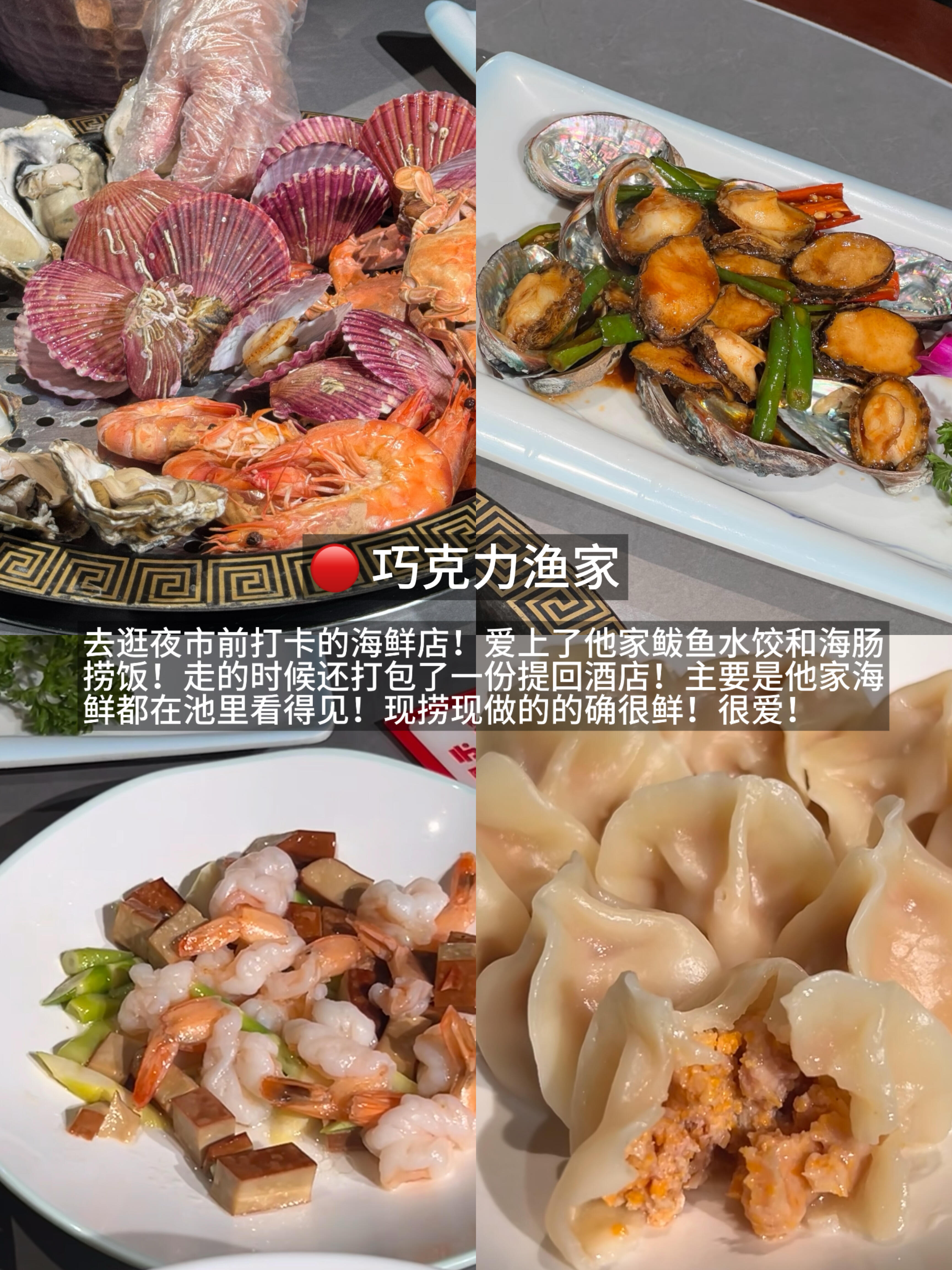 ✅巧克力渔家去逛夜市前打卡的海鲜店!爱上了他家鲅鱼水饺和海肠捞饭!走的时候还打包了一份提回酒店!主要是他家海鲜都在池里看得见!现捞现做的的确很鲜!很爱!