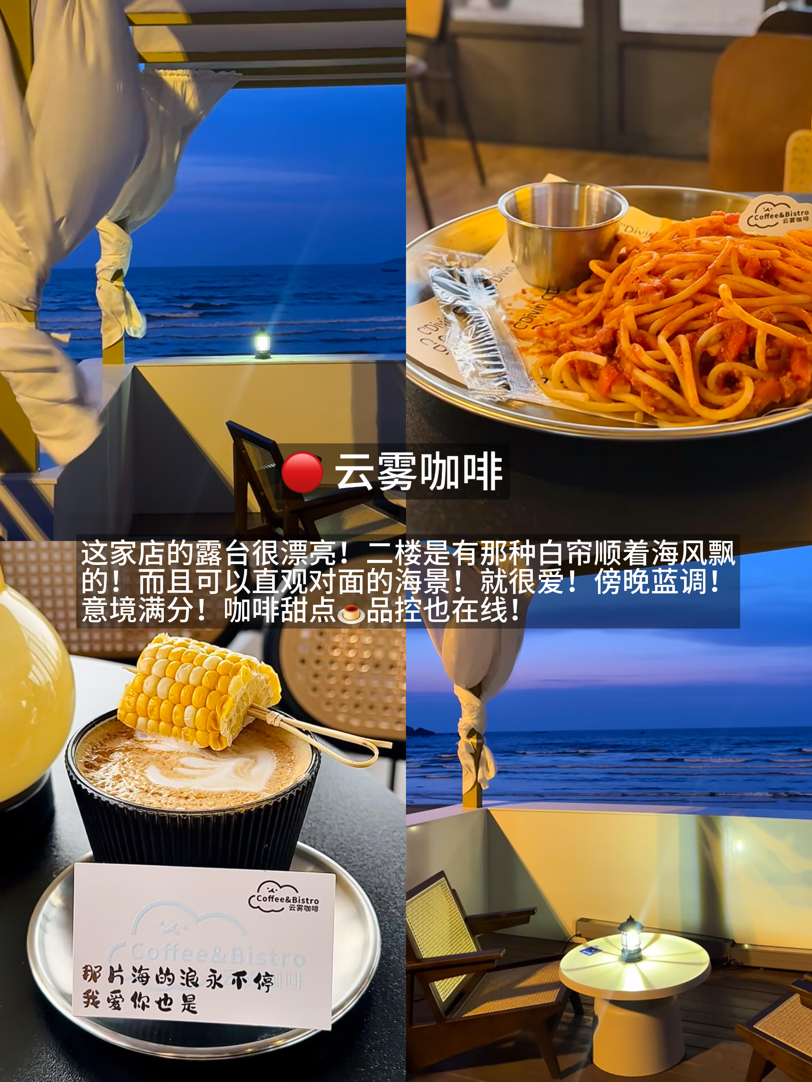 这家店的露台很漂亮!二楼是有那种白帘顺着海风飘的!而且可以直观对面的海景!就很爱!傍晚蓝调!意境满分!咖啡甜点🍮品控也在线!