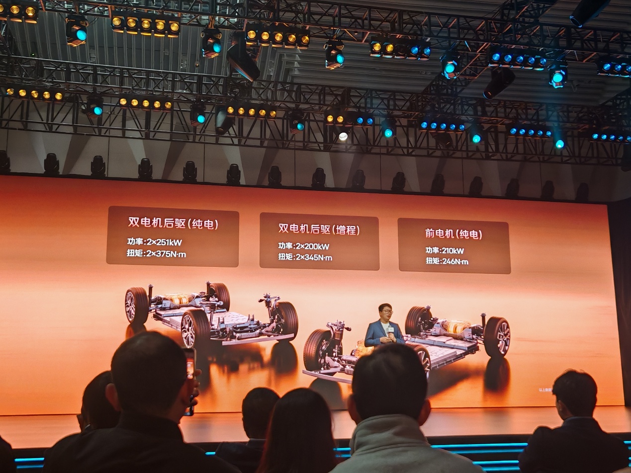 太行分布式电驱技术采用双电机左右布置的布局,太行双电机后驱(纯电)拥有2*251kW功率、2*375N·m扭矩,太行双电机后驱(增程)拥有2*200kW功率、2*345N·m扭矩,太行前电机(纯电)拥有210kW功率、246N·m扭矩。