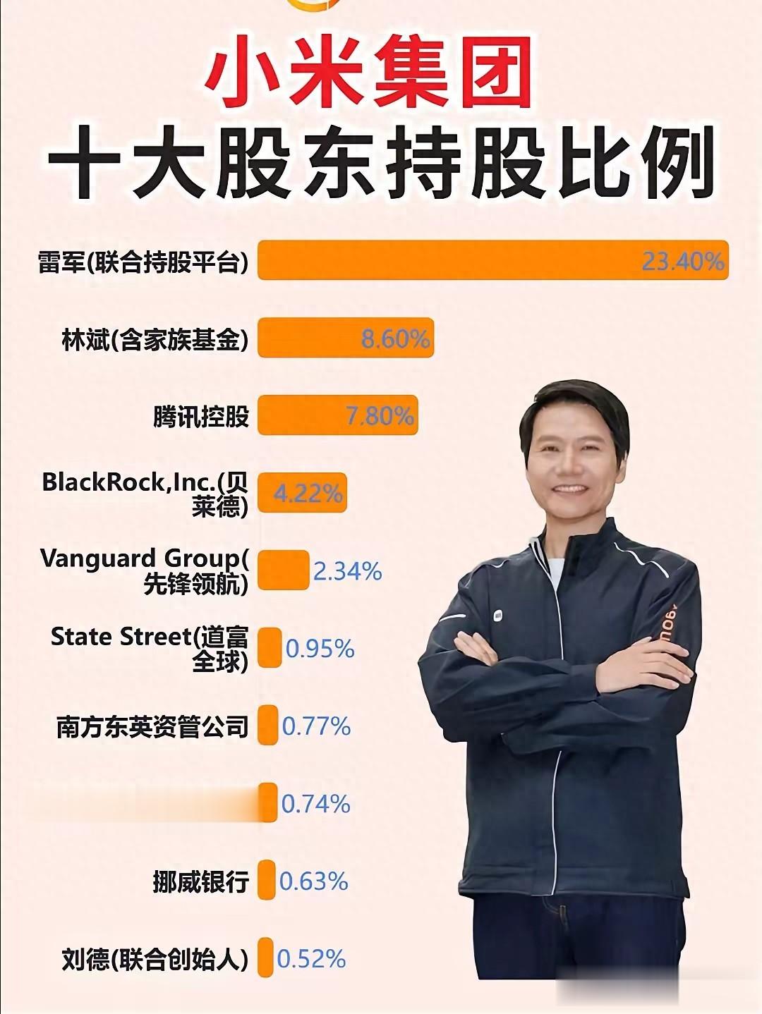 小米集团的股权结构呈现出“核心创始人主导、头部资本加持”的鲜明特征,十大股东及对应持股比例如下: