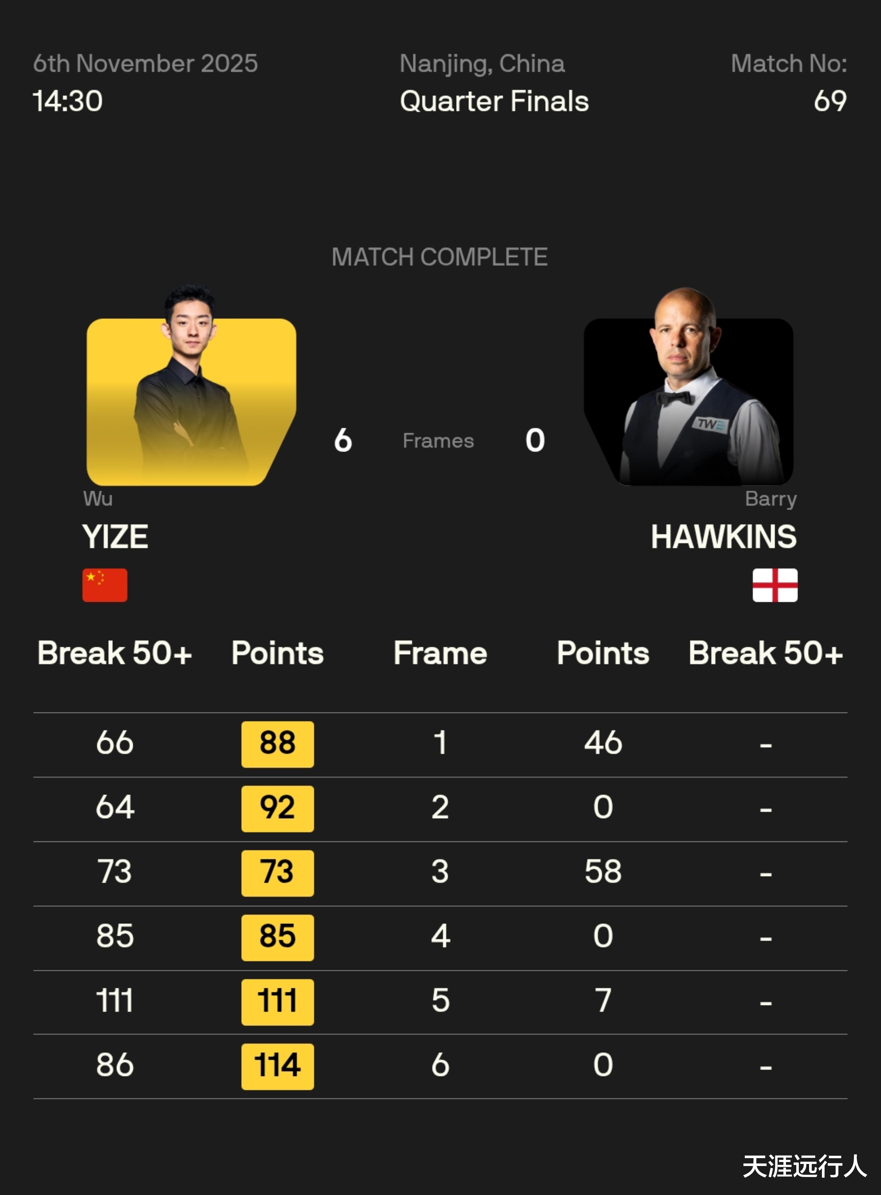 局休归来,吴宜泽轰出单杆111分的生涯第101杆破百,先达赛点,致胜的第六局,吴宜泽抓住霍金斯进攻的简单失误,再轰单杆86分,一杆制胜,以左手清彩锁定胜利,吴宜泽以6-0零封巴里·霍金斯,率先晋级2025南京国际锦标赛四强,静待马克·塞尔比与赵心童两人之间的胜者,争夺决赛资格。