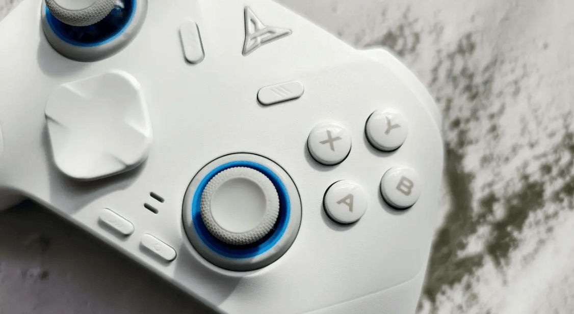 手柄整体偏清爽的白色机甲风,外壳做了微喷砂处理,手感细腻也不容易粘指纹。整机的布局沿用经典非对称配置,上手几乎没有学习成本。摇杆采用阻尼可调TMR结构,可在30~90gf间无级调节,行程更短、弹性更紧凑,快速转向手感不错,但如果你是慢慢推准心的那类玩家,会觉得前半段阻尼略硬,不是特别“跟手”。扳机支持线性和微动双模式切换,游戏场景差异明显;ABXY采用机械微动按键,响应快、回弹清脆,但键程属于较短路线,对喜欢深键程的玩家来说手感可能偏“轻”。
