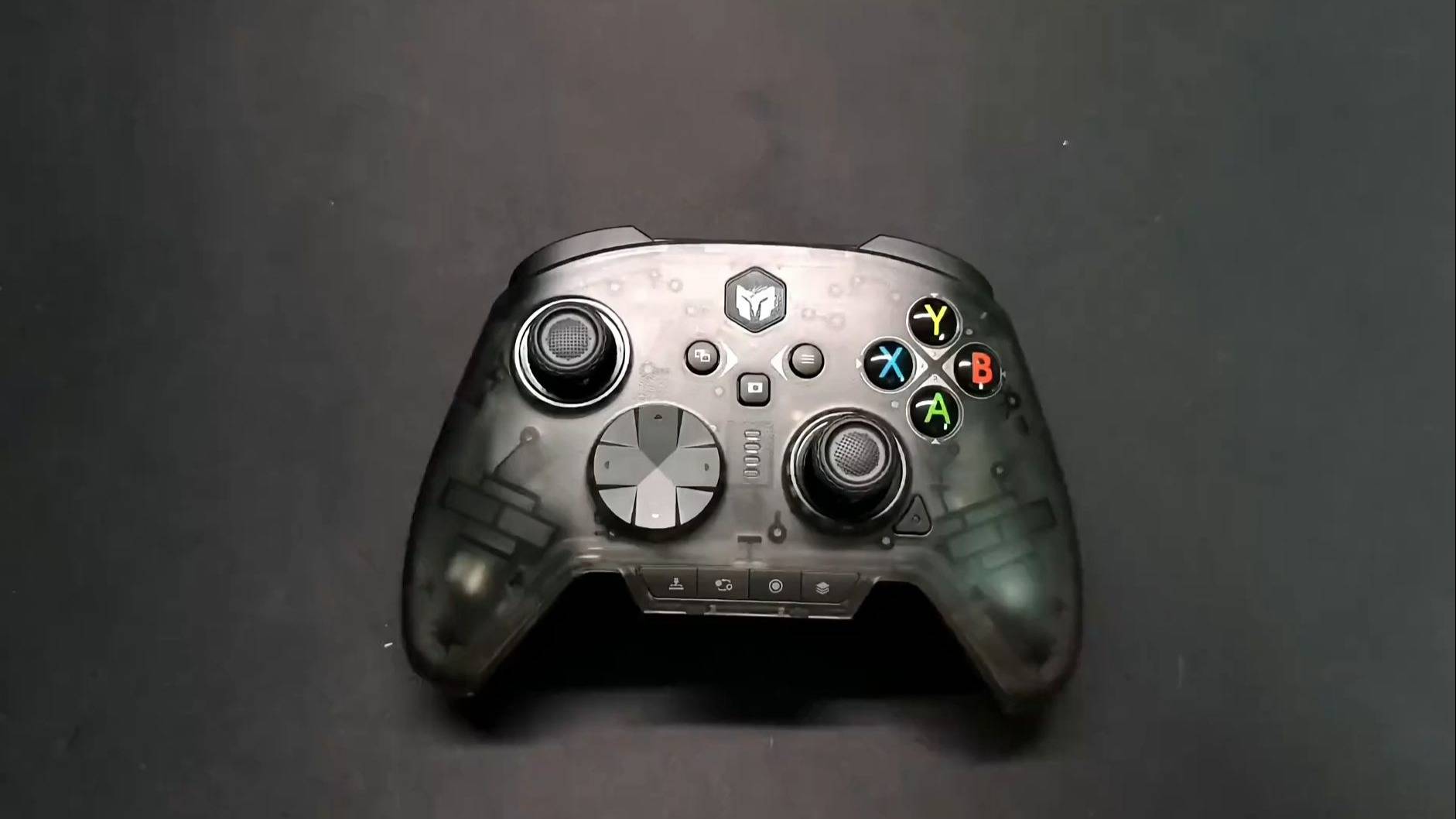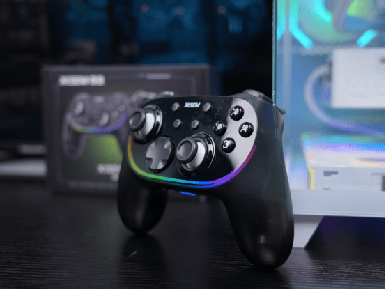 这款手柄第一眼就是熟悉的Xbox布局,拿在手上分量刚好,配套的RGB充电底座一放上去直接把电竞氛围拉满。顶部是传统的肩键+扳机键组合,底座底部还有隐藏仓,可以把 2.4G接收器和备用十字键帽一起收进去,收纳细节做得非常到位。整体手感圆润,贴合度好,长时间玩不会累,连接方式也很全:PC、Switch2、蓝牙、2.4G都能适配,还能用APP 调节,属于拿来就能无缝融入任何平台的那种。