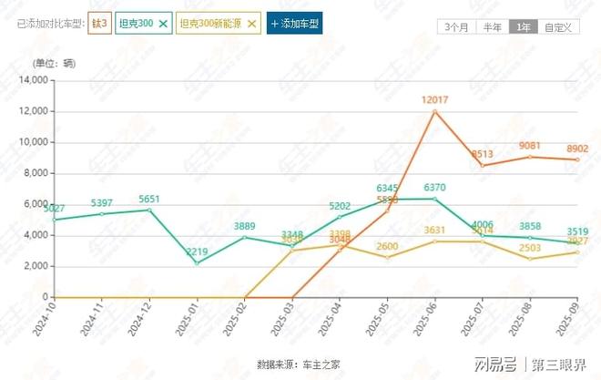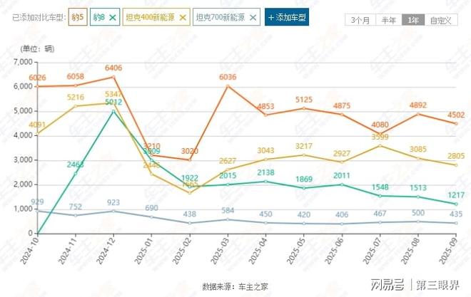 数据显示,比亚迪方程豹钛3凭借其独特的方盒子设计、纯电四驱以及高性价比,在市场上取得不错成绩。2025年9月,钛3销量达到8902辆,远超坦克300系列;同时,豹5、豹8凭借综合优势,也力压直接竞品坦克400、坦克700,这使得坦克品牌在方盒子市场的份额受到了明显的挤压。