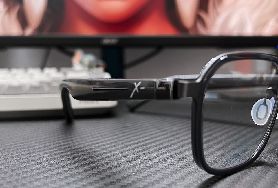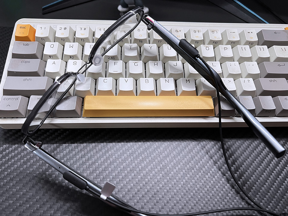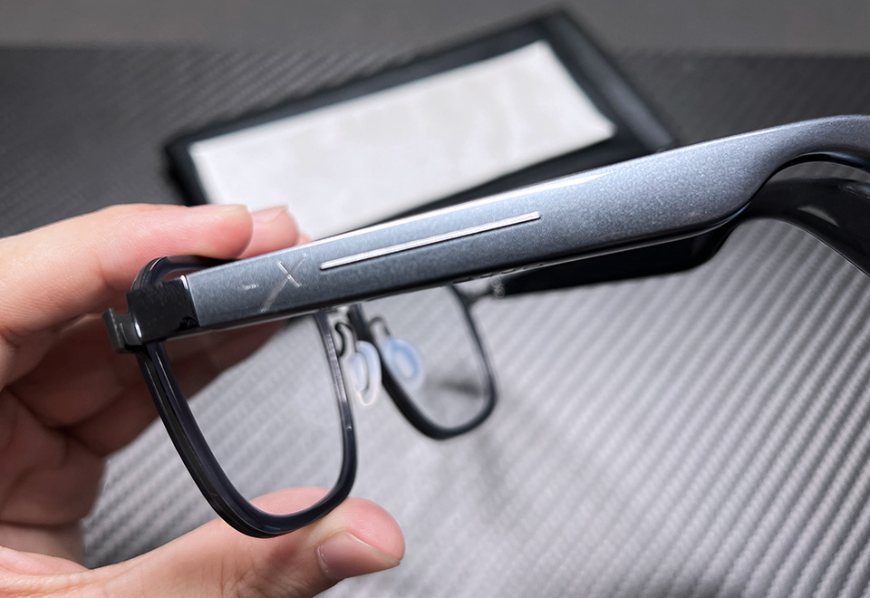 再来看看镜腿,镜腿是整个眼镜科技核心所在,因为内嵌了相对多的硬件,因此整体外观要比传统普通镜腿的宽厚一些,这也是能够理解的。