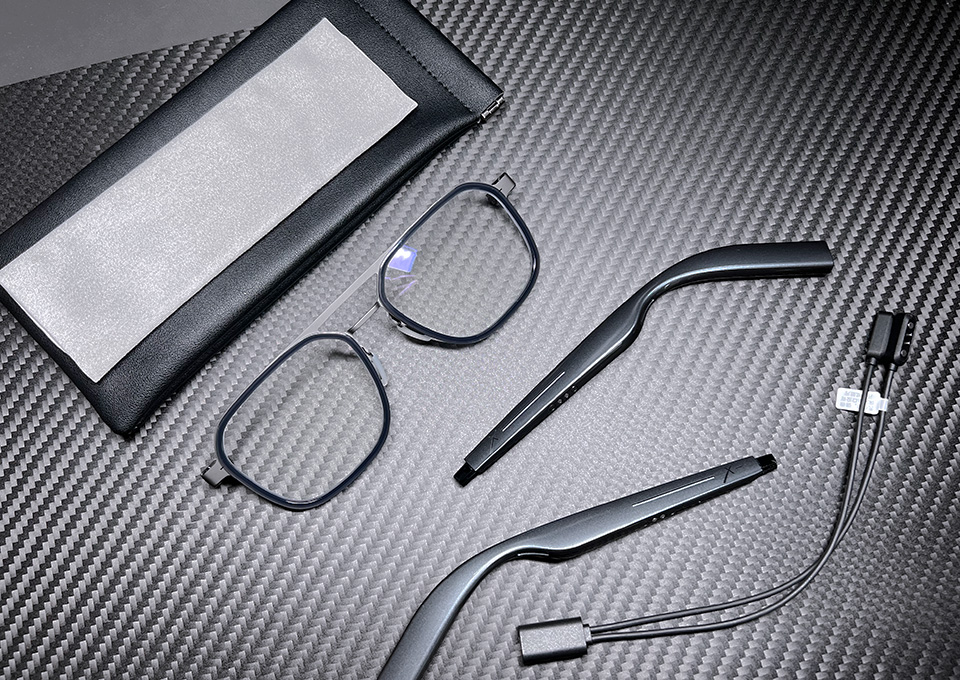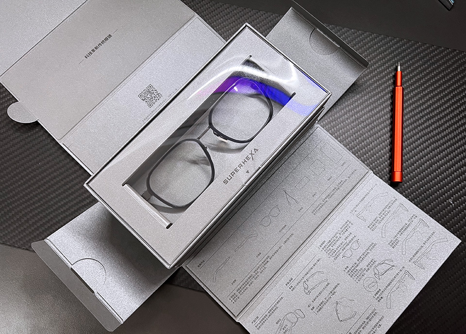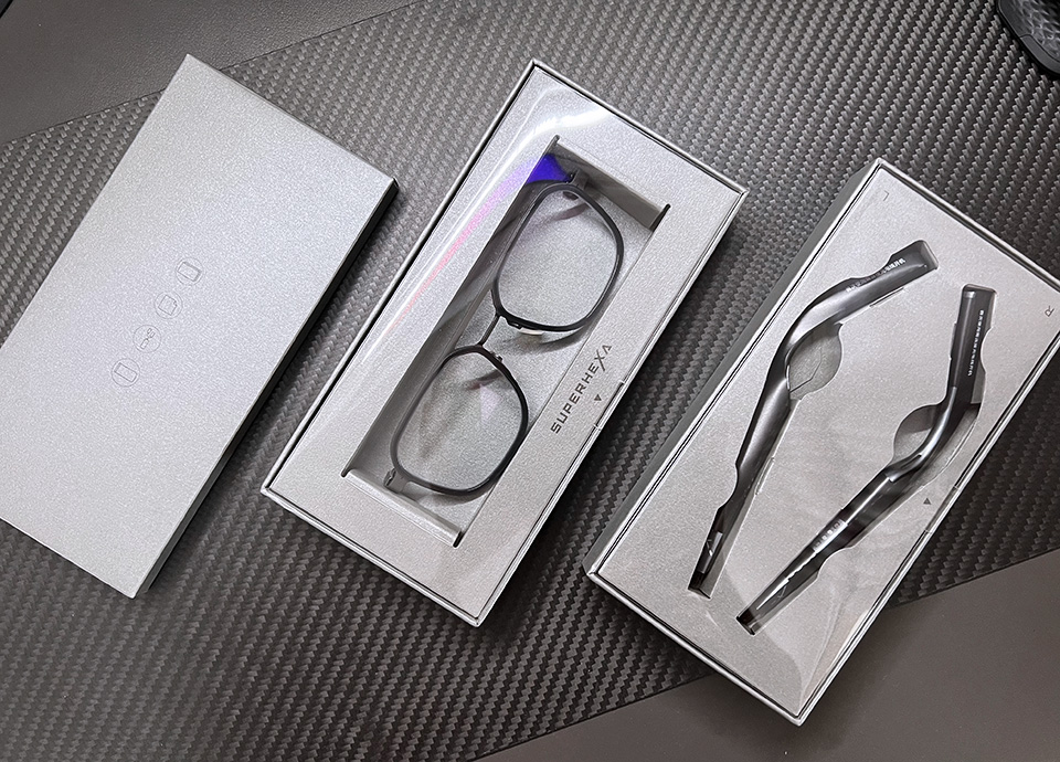 拆箱后,内部有3个独立的小包装,分别为镜腿、镜框以及相关配件(充电线、保修卡、眼镜布、收纳包)。