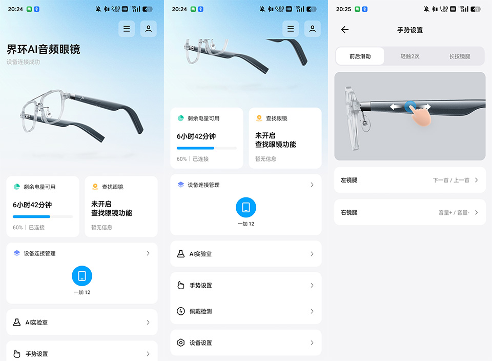 通过绑定,我们可以看到剩余电量、对眼镜进行定位,对相关手势功能进行自定义、以及连接设备管理等一些常规性操作,这块我就不过多赘述,咱们重点来看一看它的AI功能。