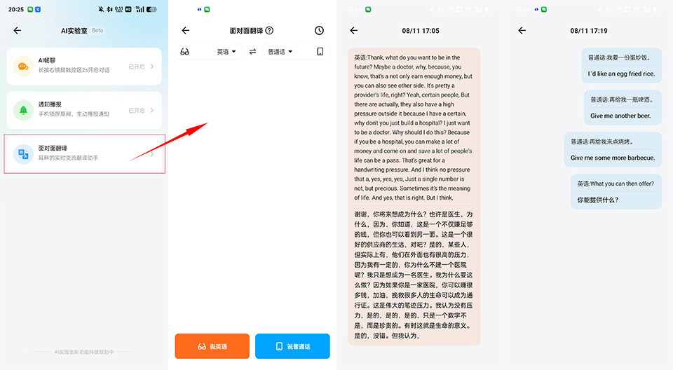 进入app中的AI实验室可以看到,界环的AI主要支持3点:AI畅聊、通知播报、面对面翻。