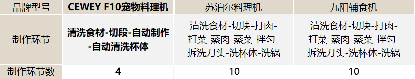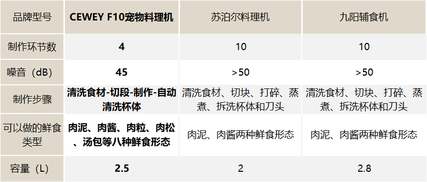 我把 CEWEY F10宠物料理机和另外两台苏泊尔料理机、九阳辅食机摆在一起测试。它们的设计思路完全不一样,所以使用效果也差得挺远。