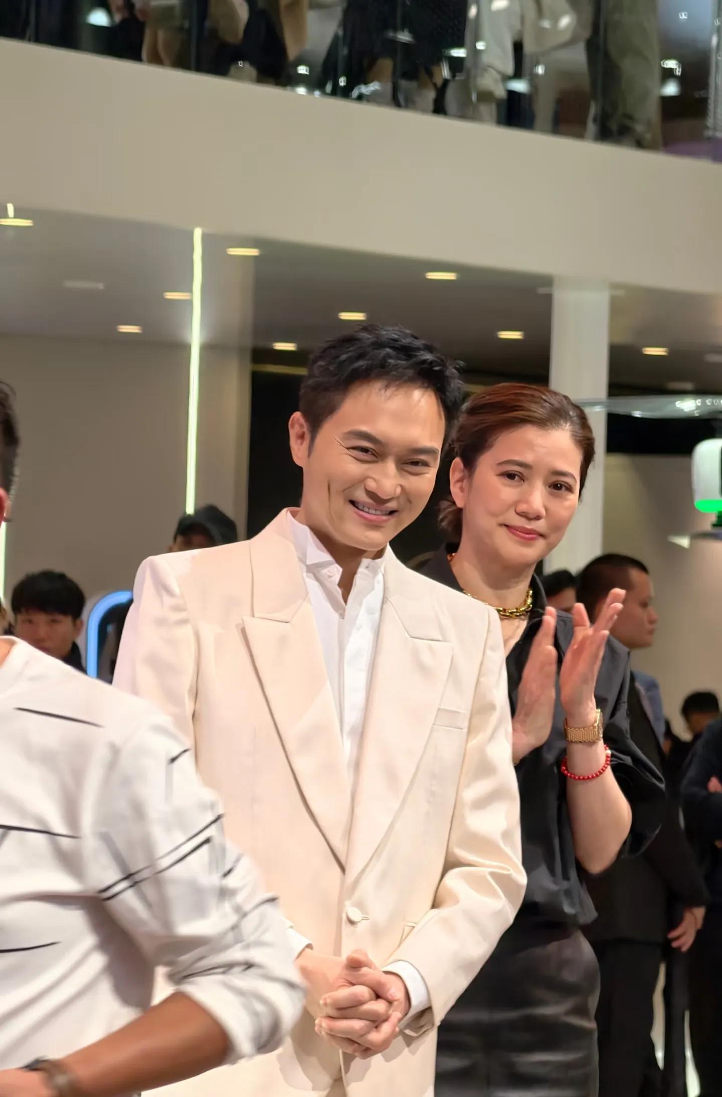 张智霖穿着白色西装非常俊气,袁咏仪则是一身黑色,夫妻俩一白一黑,夫唱妇随。袁咏仪当天的发型也很有特色,为这场活动好好准备了一番。