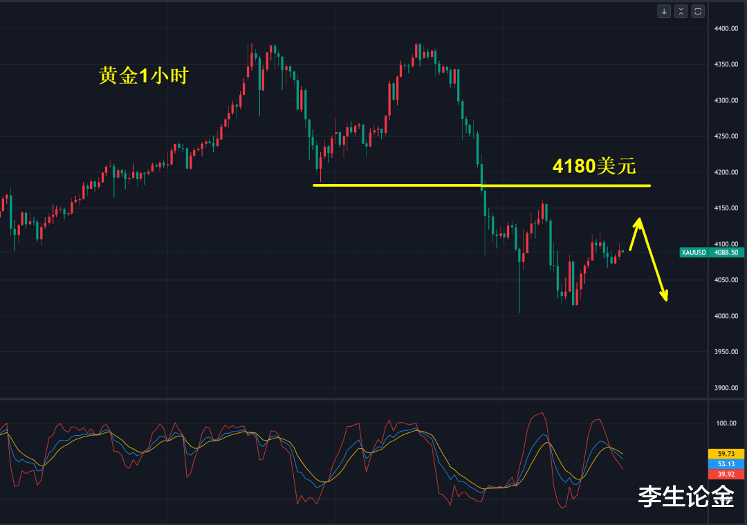 目前,金价走势结构仍然以410美元作为多空分界点,在此位置下方震荡行情将继续,而下方关键点在于4003美元的得失,只有这里再次被击穿,空头才能撕开口子延续调整,此次黄金上涨自3200美元至4400美元,空间大概1200美元,调整向下我认为极限在50%的范围,也就是3800美元附近。