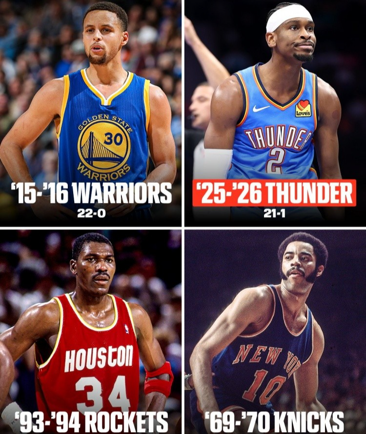 本来以为勇士队的纪录将后无来者,但随着新赛季的深入,这个纪录被打破的可能性越来越高,而最有可能打破该记录的就是今年的新科卫冕冠军,亚历山大率领的雷霆队。在这场雷霆以124-112击败勇士的比赛后,雷霆豪取13连胜,将球队的常规赛战绩提升到21胜1负。而值得一提的是,根据数据统计,雷霆已经正式成为NBA历史上第4支赛季前22场至少取得21胜1负以上战绩的球队,之前三队分别是是15-16赛季勇士(22胜0负),93-94赛季火箭(21胜1负)以及69-70赛季尼克斯(21胜1负)。