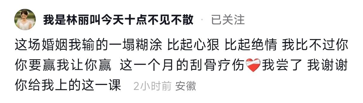 今天一早,林丽的一个视频就引起了轩然大波。她带着哭腔说,自己这场婚姻输的一塌糊涂,比起心狠,比起绝情,我比不过你,你要赢,我让你赢,这一个月的刮骨疗伤我尝了,谢谢你给我上的这一课。