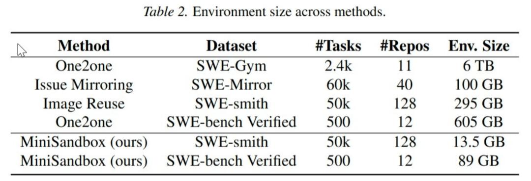 在实际效果上,SWE-MiniSandbox 使环境缓存大小降低至同类基于容器方法的 5% 左右,将环境准备时间缩短至容器基线的 25%,并且消除了对额外容器服务器的需求。