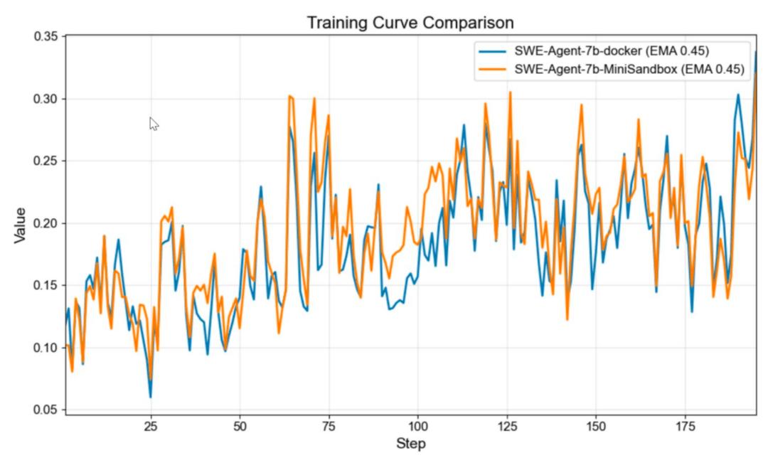 除此之外,使用 1600 条数据在 SWE-Agent-LM-7B 上训练 200 步后对比 SWE-MiniSandbox 和 Docker 环境的 Reward 曲线,发现二者走势基本一致,从而进一步验证了 SWE-MiniSandbox 提供的无容器环境能够实现和传统 Docker 环境一致的训练效果。