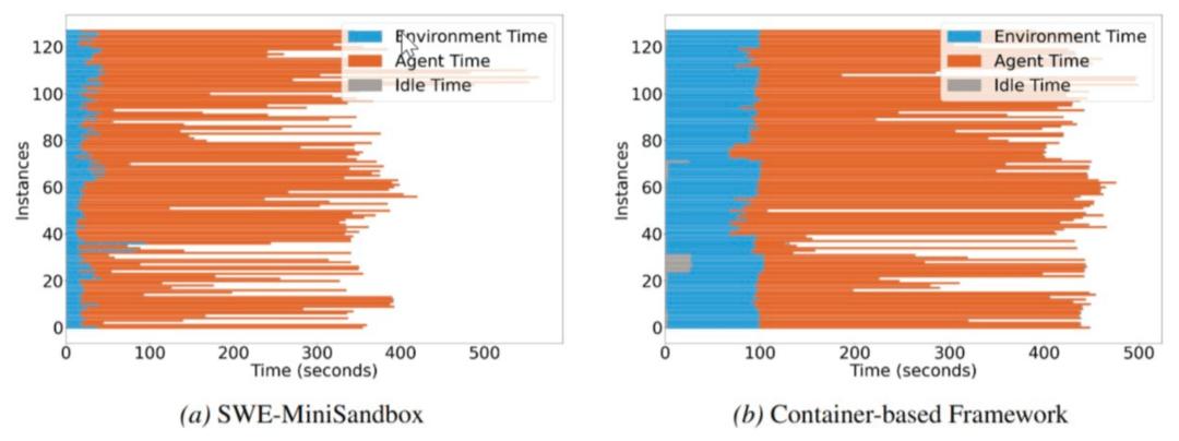 通过拆解强化学习 rollout 的时间代价并对各部分进行可视化分析,发现 SWE-MiniSandbox 在环境准备时间(蓝色)上明显短于 Docker 环境。