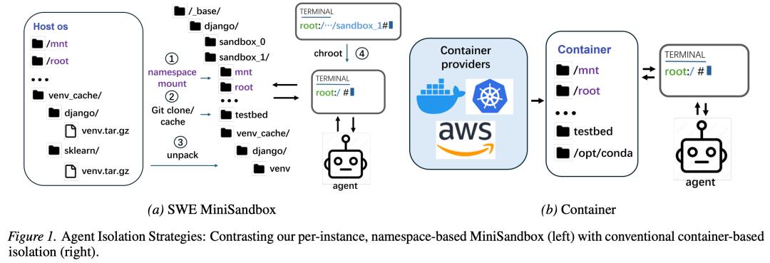 训练曲线 Demo 链接:https://wandb.ai/open_source_blank/SWE-MiniSandbox SWE-MiniSandbox 是一个无需容器(Container-Free)的软件工程沙盒环境。其目标是解决当前 SWE Agent 训练中依赖容器的痛点:需要构建和维护大量的容器镜像,并运行高性能的容器服务器集群,导致了高昂基础设施和运维成本。因此,当扩展批量规模或提高 rollout 数量时,容器服务器承载量成为主要性能瓶颈,造成计算资源受限情况下训练无法扩展,而缺乏容器管理权限或没有专用编排基础设施的从业人员则无法训练自己的 Agent。