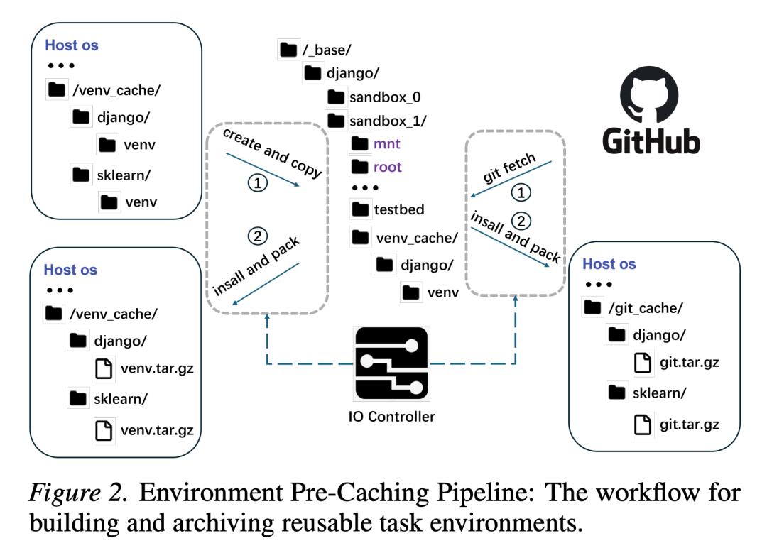 在此基础上,SWE-MiniSandbox 实现了一套环境预缓存流水线:构建基于轻量级 Python conda+venv 的混合环境,安装特定任务的依赖项,并在不同运行间复用压缩的缓存产物。通过将环境和代码仓库打包成缓存,利用基于 Ray 的资源控制和信号量来限制并发解压,从而实现 I/O 的精细管理。