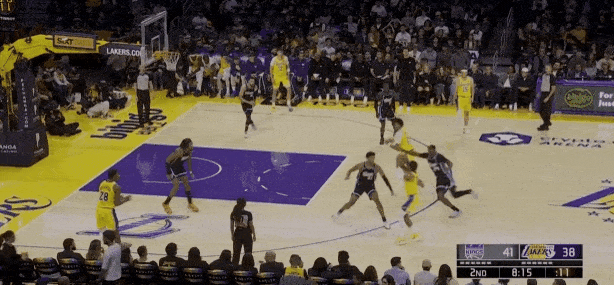 NBA季前赛,湖人对阵国王的比赛正在进行中。第二节比赛,文森特眼观六路找到中路顺下队友,海斯单臂劈扣拉文。
