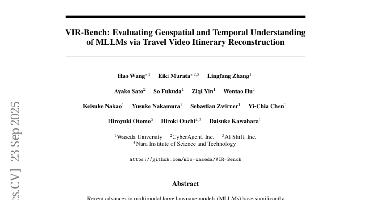 这个听起来像科幻小说的想法,现在已经被早稻田大学的研究团队变成了现实。由早稻田大学的王昊、村田栄樹等研究者,联合AI Shift公司、CyberAgent公司以及奈良先端科学技术大学院大学的专家们组成的国际研究团队,在2025年9月发表了一项突破性研究成果。这项名为"VIR-Bench: Evaluating Geospatial and Temporal Understanding of MLLMs via Travel Video Itinerary Reconstruction"的研究,开创性地让AI学会了从旅游视频中理解空间位置和时间顺序,并能据此重建完整的旅行路线。有兴趣深入了解的读者可以通过论文编号arXiv:2509.19002v1查询完整论文。