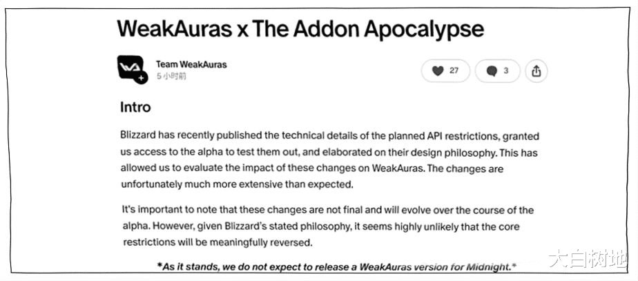 各位魔兽世界玩家,今天魔兽圈可真是炸锅啦!凌晨的时候,WeakAuras(WA开发团队发布了一则公告。这颗“重磅炸弹”啊它不仅仅与WA插件的未来息息相关,甚至有可能对整个游戏体验都产生影响呢。