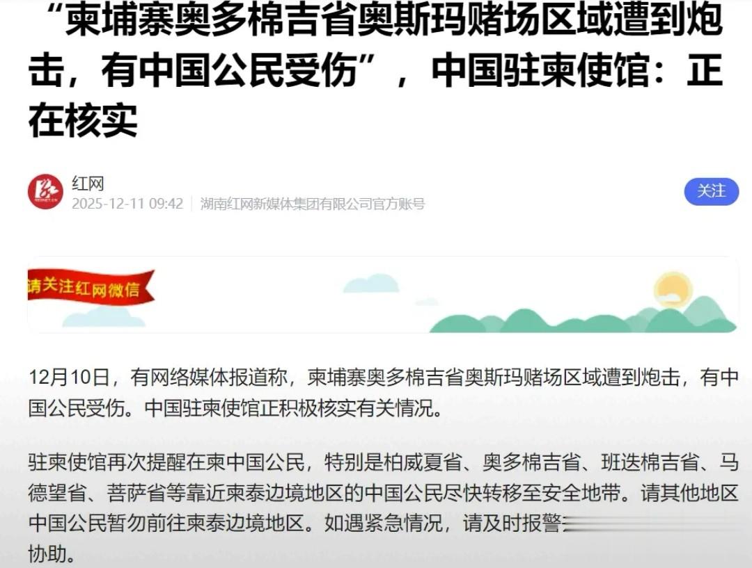 事件的导火索可追溯至今年10月,当时在中、美、马三国的斡旋下,泰柬双方曾签署停火协议。然而,协议墨迹未干,两国围绕边境争议地区的矛盾再度激化。12月10日凌晨5点,泰国陆军第二军区突然向柬埔寨奥多棉吉省发动攻击,炮火甚至波及当地一家中国投资的奥斯玛赌场,造成多名中国公民受伤。