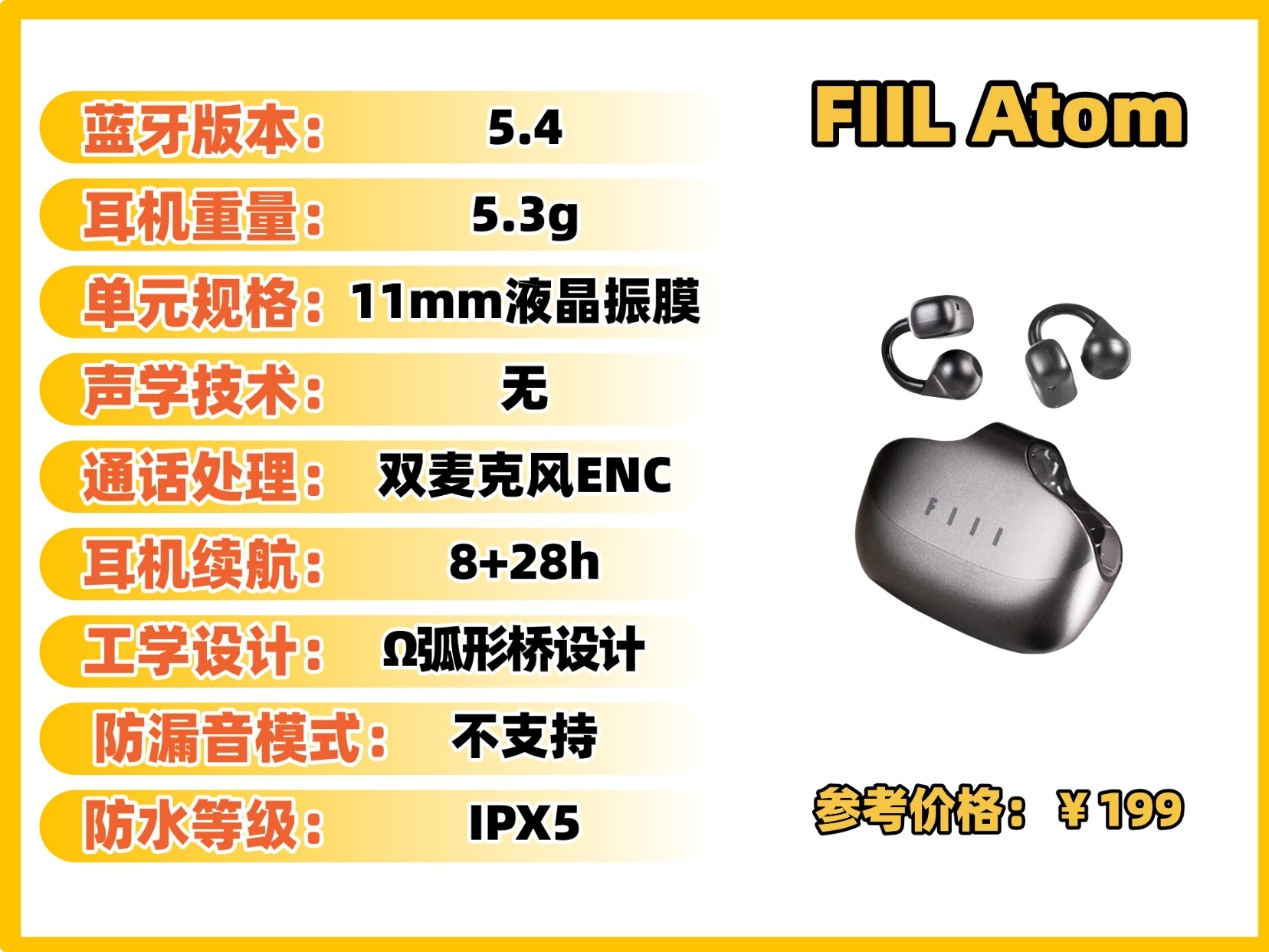 性能方面:FIIL Atom 搭载了蓝牙 5.4 技术,连接速度很快,也稳定。续航也不错,据官方资料,他的总续航能达到36个小时,一般能用个好几天,通话方面支持双麦克风ENC通话降噪,通话也方便,就算是在嘈杂的街头也能清晰的听到我的对话声