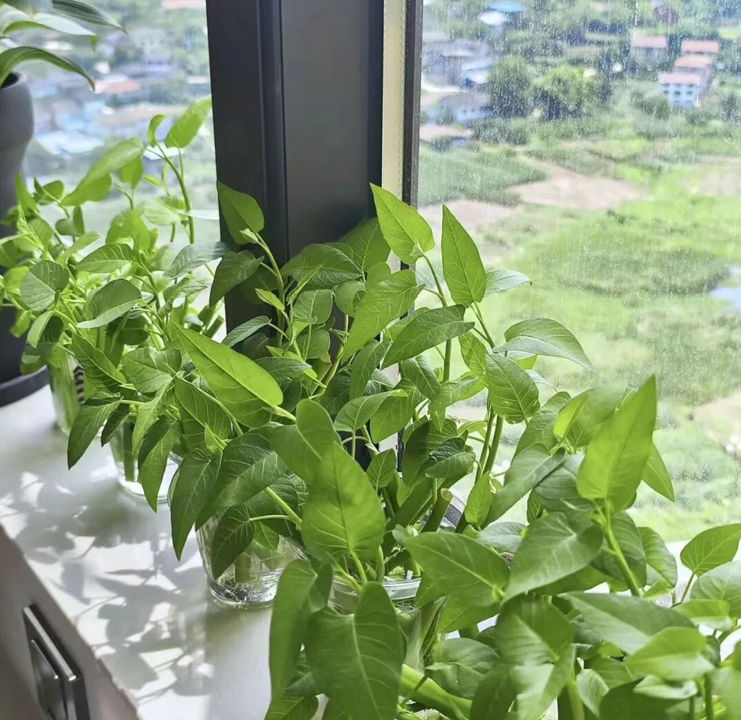 02 空心菜是懒人福音:插枝就活,水培土培都能行看评论才知道,空心菜是真 “皮实”—— 网友说 “掐几根枝条扔水里,10 天长满盆”“地栽插枝浇点水,半月能剪着吃”。我之前犯傻花 10 块买种子,泡半天没出芽;后来掐邻居家嫩枝插泡沫箱,7 天就冒白根,比种种子快多了。
