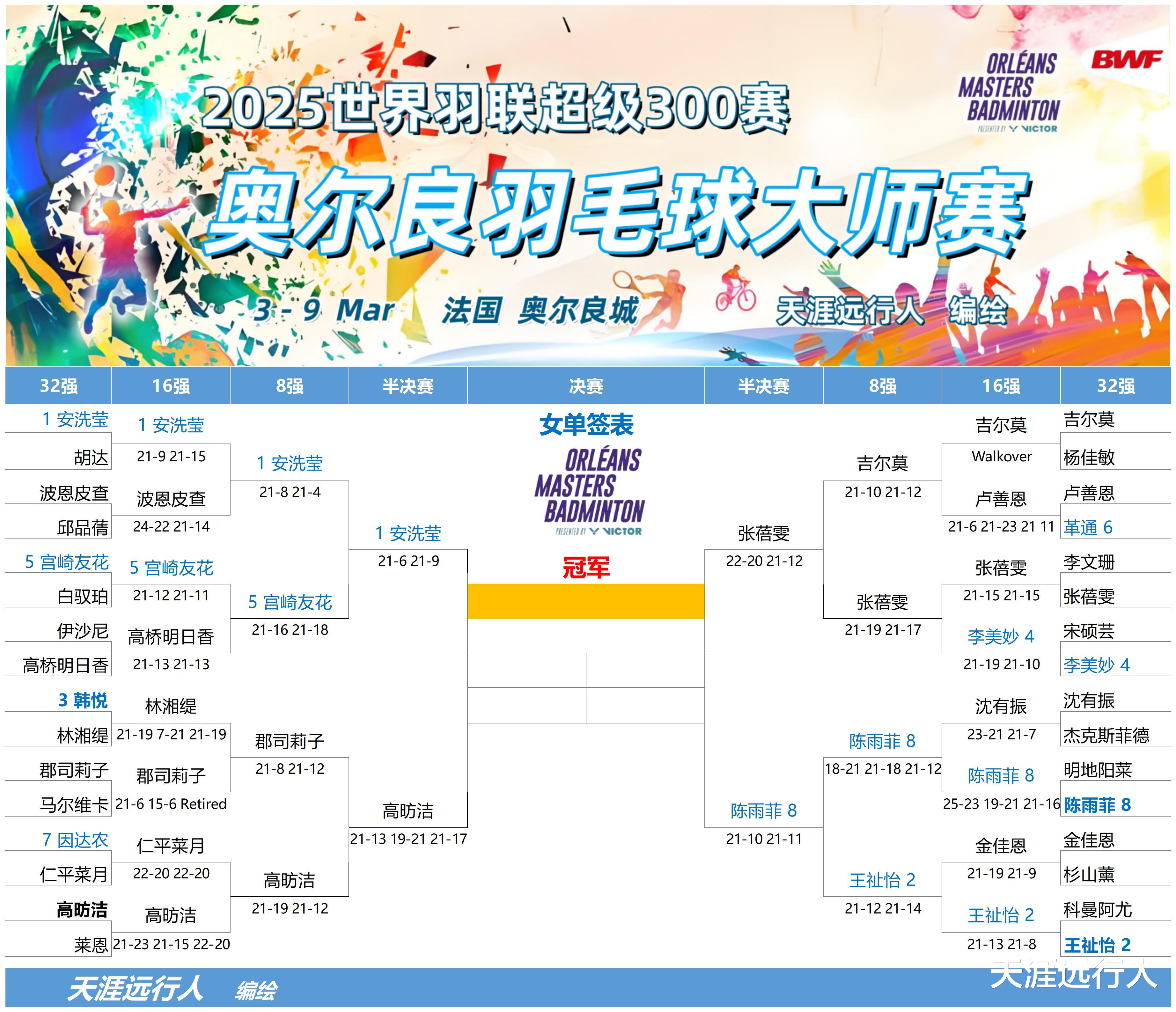 北京时间3月8日凌晨4时17分,2025世界羽联超级300奥尔良大师赛8进4轮次的20场角逐,全部决出了胜负。