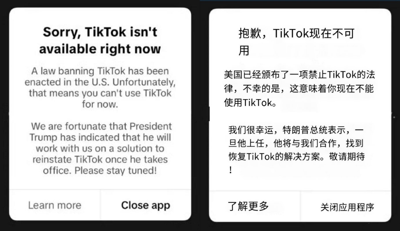 通告里还说:“美国已实施一项禁止 TikTok 的法律。很不幸,这意味着您目前无法使用 TikTok。我们很幸运,当选总统特朗普表示,他将与我们合作,在他上任后找到恢复 TikTok 的解决方案。请继续关注!在此期间,您仍然可以登录下载您的数据。”