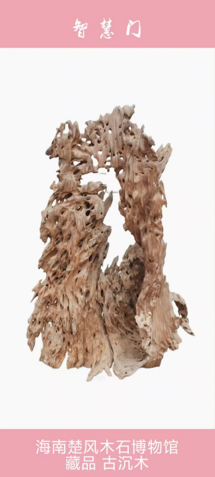 大约1993年秋天,我从湖北荆州南下,上岛不久,省兰花协会组织兰友五指山采兰,在深山一猎户家求得宝贝。除了山色云气苔痕,此作无一丝人工刀斫斧劈痕迹,浑然天成,质地如镶玉嵌珠,形似一门,故名《智慧门》。