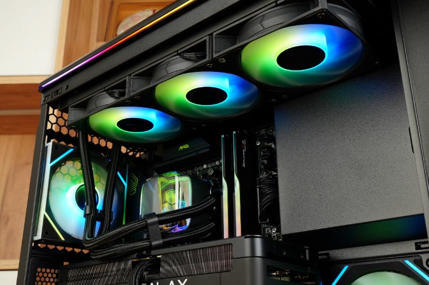 顶部的风扇支架最大可以支持360mm规格的冷排。