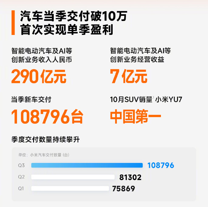 本周小米集团Q3财报显示,小米汽车首次实现季度盈利(经营盈利7亿元),Q3营收达到290亿元,交付数量为108796台,多项重要经营指标均再创新高。