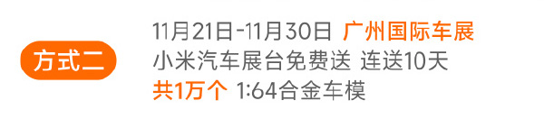 11月21日,2025广州车展媒体日开启,本届车展展出车型超过1000台,新车首发93台。据现场观察,小米汽车展台依然人气很高,在去年大受好评的为观众送饮用水基础上,今年广州车展小米还送车模,每天1000个,连送10天(现场领取规则可见下图)。